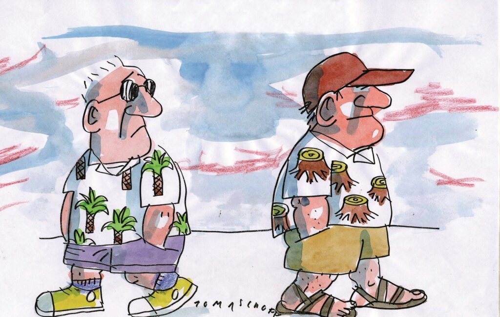 Die gezeig­ten Arbei­ten stam­men von 40 Kari­ka­tu­ris­tin­nen und Kari­ka­tu­ris­ten. Mit Humor, Iro­nie und deut­li­cher Kri­tik grei­fen sie zen­tra­le Fra­gen der Gegen­wart auf. Im Mit­tel­punkt ste­hen dabei die Wider­sprü­che zwi­schen gesell­schaft­li­chen Ansprü­chen und dem eige­nen Ver­hal­ten. The­men sind unter ande­rem Euro­pas Umgang mit Geflüch­te­ten, die Mecha­nis­men der Kon­sum­ge­sell­schaft sowie die welt­wei­ten Ver­flech­tun­gen von Wirt­schaft und Hun­ger.