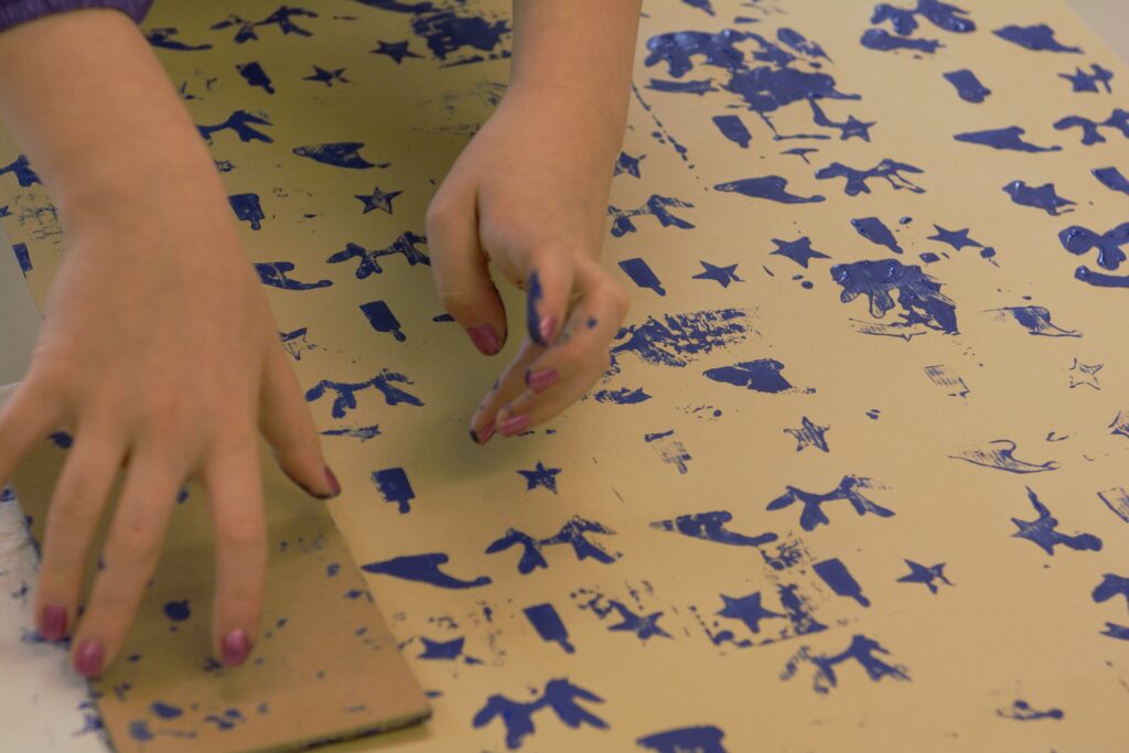 Mithilfe von Stempeldruck entstehen ganz persönliche Papiere für die Geschenke unter dem Weihnachtsbaum. Das Angebot richtet sich an Kinder und Erwachsene gleichermaßen.