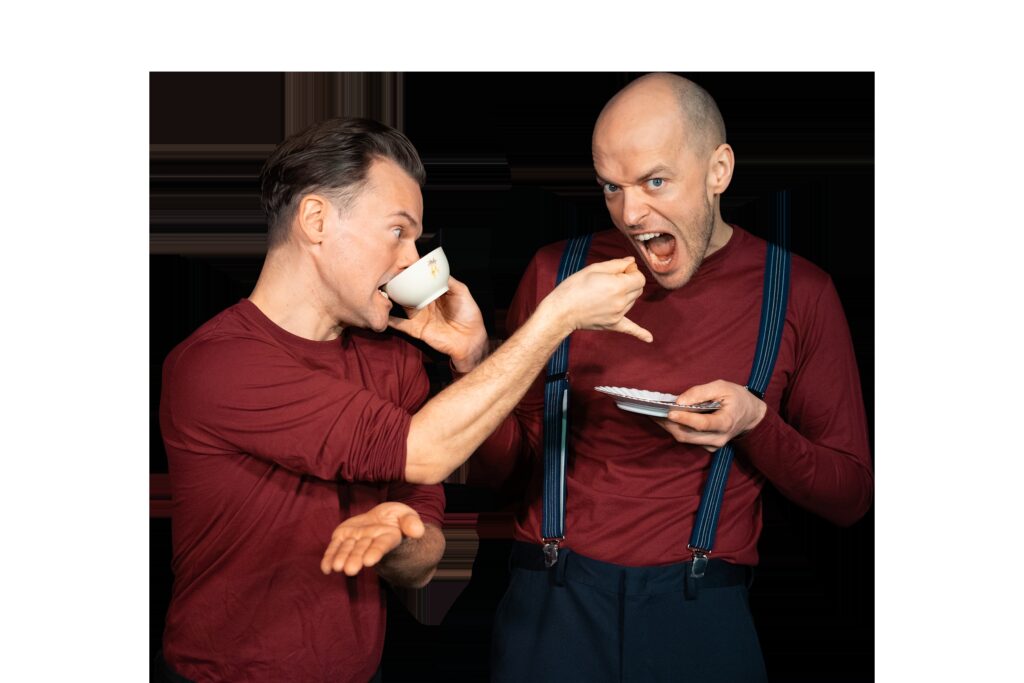 Hinter den Figuren stehen die Theatermacher Paul Schröder und Jonas Schütte. Gemeinsam erschaffen sie zwei schräge Cartoonwesen, die sich in einer Art lautmalerischem Kauderwelsch zwischen Finnisch, Niederländisch und undefinierbarem Gurgeln verständigen – unterstützt durch eine Übersetzungsmaschine, die alles noch absurder macht.